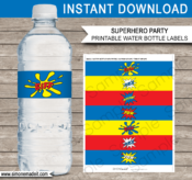 Superhero Comic Book Free Printable Water Bottle Labels.pdf The Superhero printable set includes a sign, backdrop, invitations, mini candy bar wrappers, water bottle labels, thank you cards, cupcake toppers, blank tented cards for place cards or menu cards, gift tags and lots more for you to choose from! For Personal Use Only. Do not modify, change, redistribute or sell.